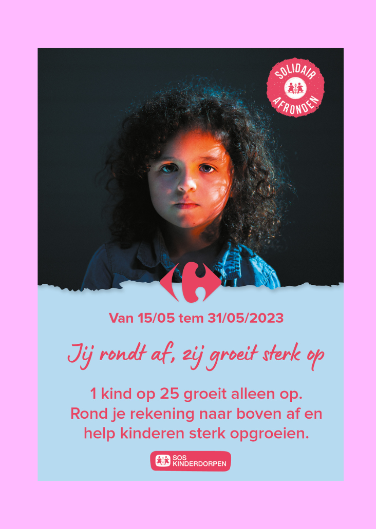 De sterke campagne boodschap: "In België groeit 1 kind op 25 alleen op. Daarom organiseert Carrefour de solidaire afronding ten voordele van SOS Kinderdorpen. Rond straks aan de kassa je totaal naar boven af en help kinderen sterk opgroeien. Want groot worden kan je niet alleen.”
